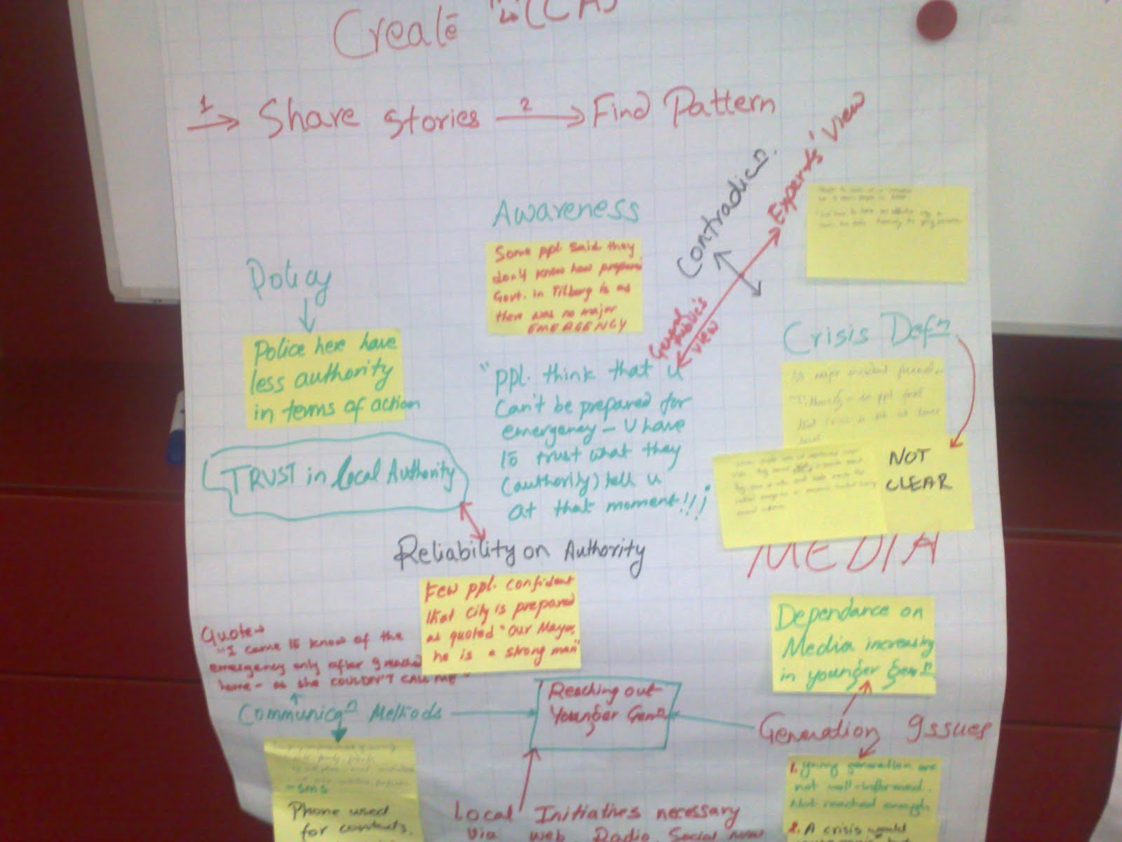 The focus for this half-day Design Camp was to introduce a Human-Centered Design (HCD) perspective and research approach to the Phd-students. The HCD-toolkit from IDEO was used in order to target the design challenge of “improved information technology for Citizens crisis preparedness and response“. The goal of the design camp was to shed a bit more light on the often promising concept of involving and provide participation for citizens from a crisis preparedness and response perspective. But the the big question is really, how could such participation be manifested in terms of processes and technologies. How do everyday people view Crisis Preparedness and Response? Go talk and listen to them is perhaps a good starting point.