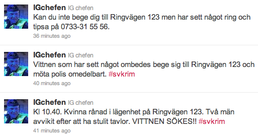 Under förmiddagen idag rånades en person i sin lägenhet i Stockholm. Två personer avvek från platsen och polisen söker nu via Twitter vittnen till händelsen. Detta måste ju vara ett bra exempel på hur delar av Polisen nu inte bara förstått nyttan av social media utan också snabbt kan nå ut och knacka dörr på ett helt nytt sätt. Återigen är det IGchefen som visar framfötterna.