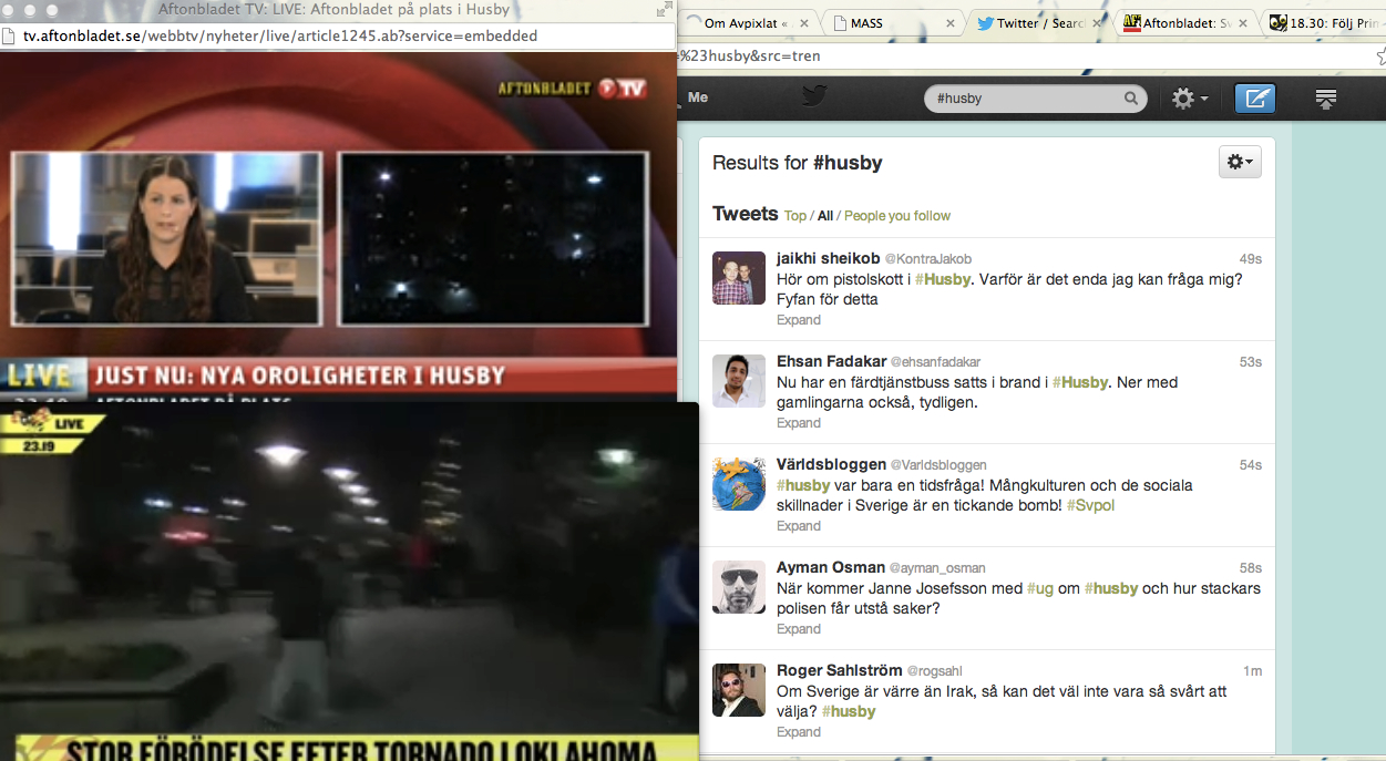 Bild: Direktrapportering via webTV-kanaler och Twitter (Hashtag: husby)