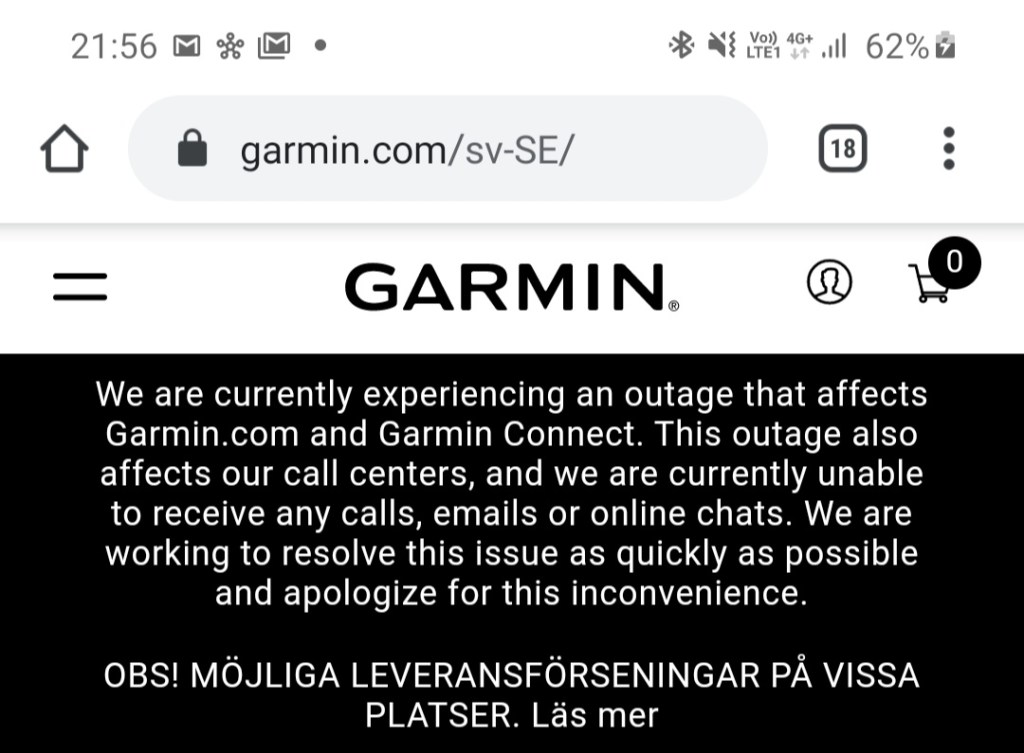 Sedan den 23 juli ligger Garmin Connect nere, enligt vissa uppgifter på grund av att de är utsatta för ransomware. Utan GC så kan träningspasset som loggats i Garmin-klocka inte laddas upp, analyseras, visas upp för andra, eller delas till andra appar och tjänster.