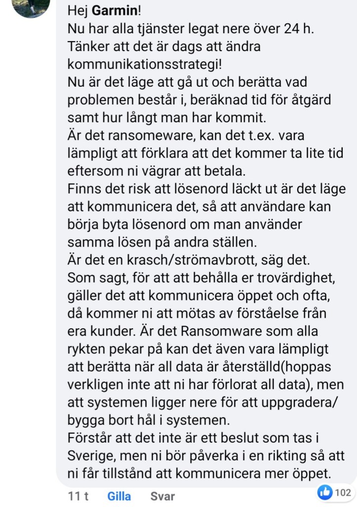 Kanske är det så att alla träningsdataplattformar sitter och funderar över sin IT-säkerhet och möjligheterna att hantera en sådan situation som nu Garmin tycks sitta fast i.