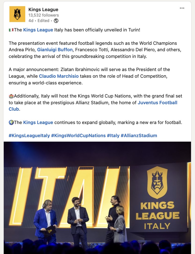 Det är intressant att följa hur Gerard Piqués skapelse Kings League och Queens League snabbt sprider sig som en ny form av fotbollsunderhållning. Genom att integrera element från gaming och streamingvärlden har något nytt skapats som attraherar en bred publik, särskilt den yngre generationen som är vana vid digitala och interaktiva format. Nu lanseras Kings League Italy, med vår egen Zlatan Ibrahimovic med en nyckelroll. Kul!